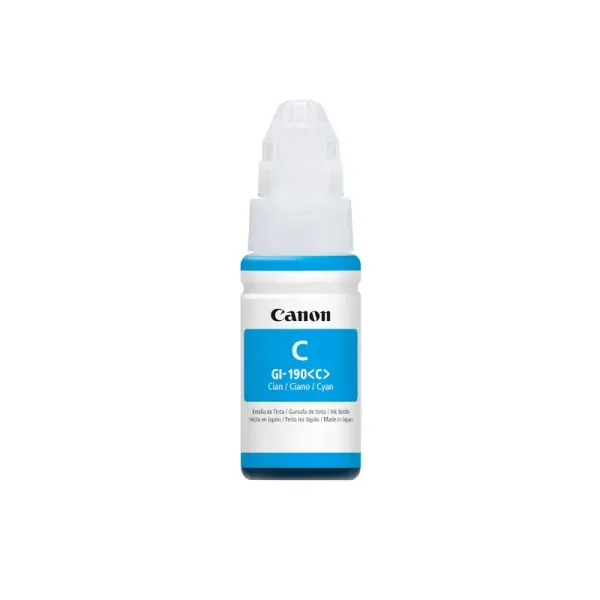 Botella de tinta cyan Canon GI-190 de 70ml para impresoras.